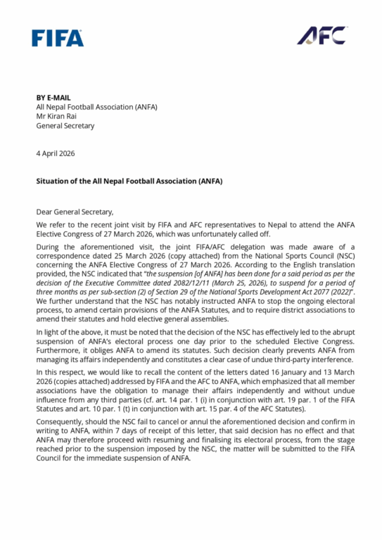 अन्तर्राष्ट्रिय फुटबल महासङ्घ (फिफा) र एसियाली फुटबल महासङ्घ (एएफसी)ले अखिल नेपाल फुटबल सङ्घ (एन्फा)को निर्वाचन ७ दिनभित्र चुनाव हुने सुनिश्चितता नभए निलम्बन प्रक्रिया अघि बढ्ने चेतावनी दिएका छन् । फिफा र एएफसीले शनिवार एन्फा महासचिव