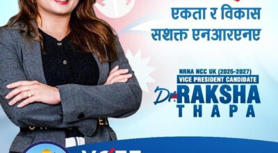 लन्डन–लन्डनस्थित एक सफल महिला उद्यमी डा. रक्षा थापाले एनआरएनए यूकेको उपाध्यक्षमा उम्मेदवारी घोषणा गरेकी छन्