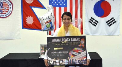 अमेरिकन तेक्वान्डो मार्सल आर्ट्स एकेडेमीकी प्रशिक्षक बुसाबुम नम्रता पौडेल लाई अमेरिकन मार्सल आर्ट्स अलायन्सले हु